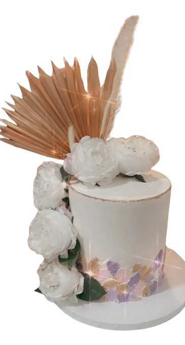 Our tiered cake com in different sizes. We offer small to medium tiered cakes, feeding between 20-65 people.